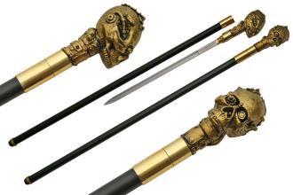 36.75" BRASS FINISH SKULL SWORD CANE. 440 stainless steel blade