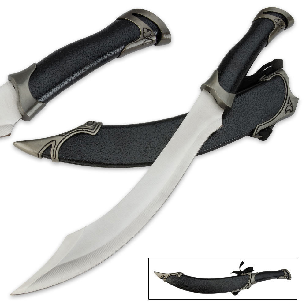 Proudly display this Arabian Saber knife for everyone to see! This saber will be the envy of your sword collector friends. It is both functional and displayable. The 440 stainless steel blade is mirror-polished for a sleek look. The handle is constructed of black imitation leather with cast metal accents. Includes a matching scabbard.