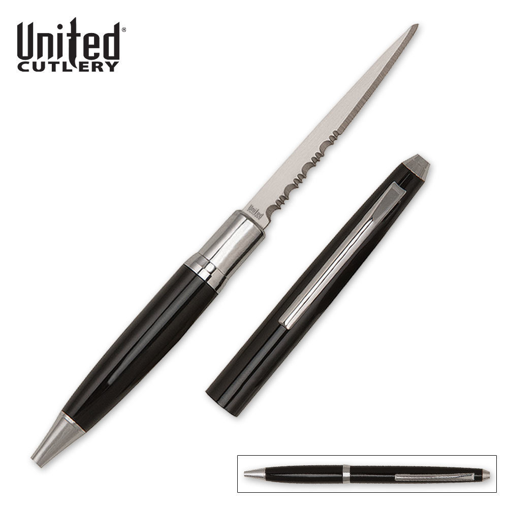 This fully functional ink pens contains a concealed serrated knife blade. Just twist the handle to extend the pen point, or pull apart to reveal the blade.