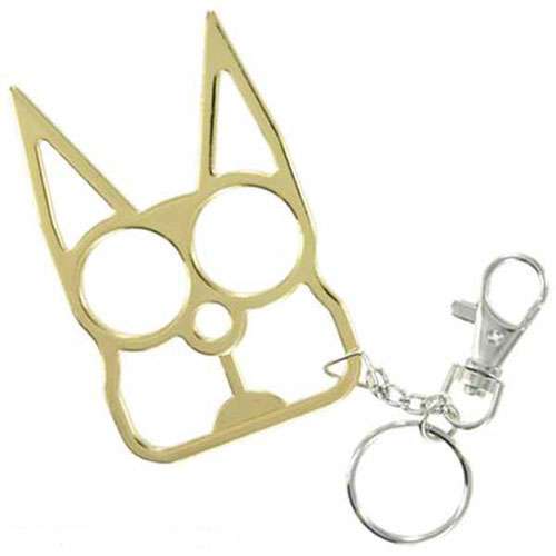 Cat Self Defense Key Chain- Gold This unique Gold Cat Defensive keychain packs a sharp punch! The eyes of the cat become finger holes and the ears become spikes when clutched in your hand to create an excellent means of surprise-defense against an attacker. The finished stainless aluminum charm includes a stainless ring and clasp for attaching keys. This keychain looks non-threatening, is easy to carry, and will provide you with peace of mind! Size 3.14 X 1.96 inch