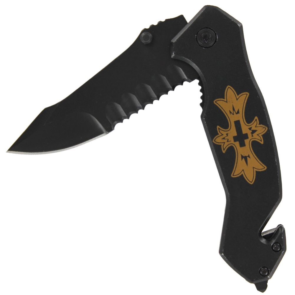 This knife sports a drop point style black finish blade with a partially serrated edge and features an ambidextrous thumb stud on each side of the blade. The sleek aluminum handle has a steel frame with double wall reinforcement. The pommel includes an emergency glass breaker which can break any tough glass in case of an emergency. Included is a belt clip and overall length is 8 inches.