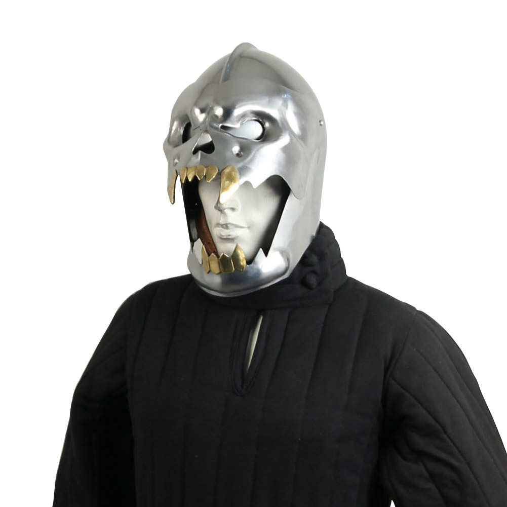 This helmet is made from steel and hand polished. It features brass dog like teeth for a malevolent effect. This entire piece was hand forged. On the side there is a lock and release for the movable face mask. The inside features a leather suspension liner to adjust to your size with a brass buckle. This demonic helmet is just terrifying to look at. It will intimate your opponent without you having to do anything but stand there. Overall Height: Approximately 11 Inches.