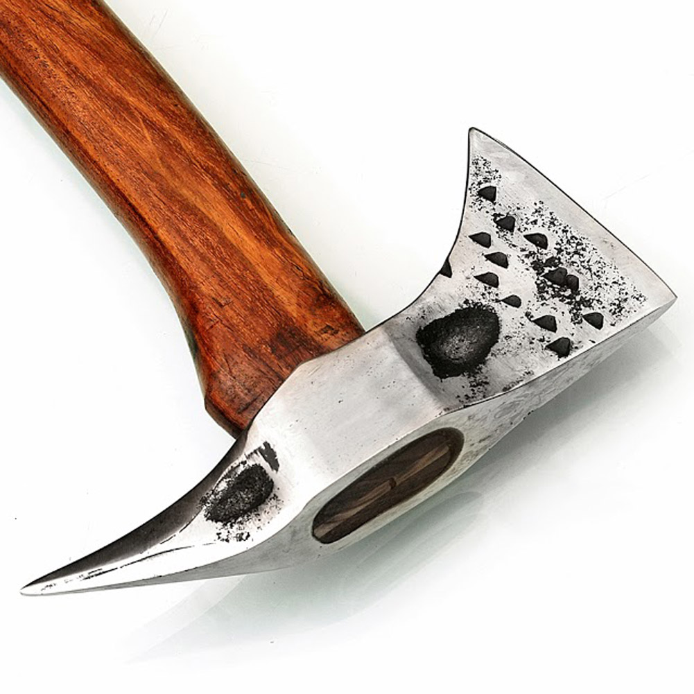 This firemans hatchet is hand forged from carbon steel with a heavy duty construction. It is an ideal tool for demolition work. The blade is 3.25 inches in length and comes sharp but could do with some extra honing. The head is thick with a spike or pick on the back which comes to a sharp point. It is a great prying tool for wood and sheetrock. The axe comes with decorative roughened pits on both sides. The handle is stained in a warm oak finish and made from sheesham. The end features a lanyard hole. This hatchet delivers a serious blow in times of emergencies but it is not only useful in emergencies..Oh no, you can take it camping or hunting. Firewood is always needed. This functional beauty will make any job a breeze. Overall Length: 19 Inches.
