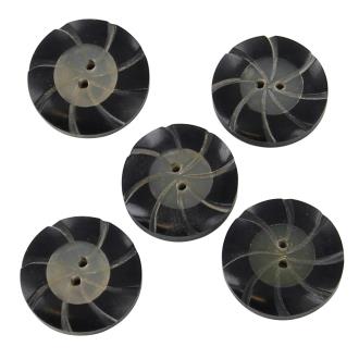 This beautiful set comes in a pinwheel design that has been hand carved. The very center has a tan circle that features two holes for adhering the buttons. Decorate pillows, curtains, or apparel; the possibilities are endless. These buttons look great on shirts, coats, or bags. This set comes with five buttons and are all constructed of real all natural horn. The Fashionista in you will come alive and make a statement no matter what you are wearing. Specifications: Overall Diameter: 1 Inch Material: Horn Species: Bovine Features: Finish: Polish Style: Two Hole Color: Black and Tan 5 Piece Set Handmade