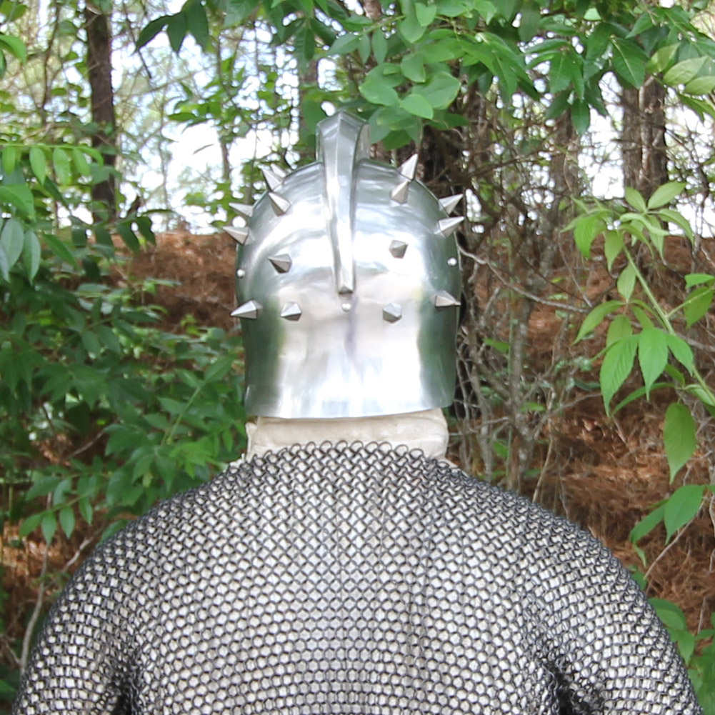 From the Gladiator movie comes this functional replica Helmet of the Spaniard. The steel is thick and hard for absolute armor protection. At the top is a contoured crest, welded on, diverting any strikes from the top. The front spikes out and adds the intimidating factor needed in an arena. 20 Steel Spikes are fixed all across the rounded helmet. The rear of the helmet slopes down and away, protecting the neck. The front of this helmet has a steel Basinet Visor riveted on that adjust to any size or style. The face is protected well. Contours of the nose and brow reinforce the structure of the Helmet of the Spaniard. Inside the helmet is a soft leather liner. The liner is fully adjustable to any size. It suspends the top of the helmet well above the head, so any impact will be absorbed across the entire helmet.