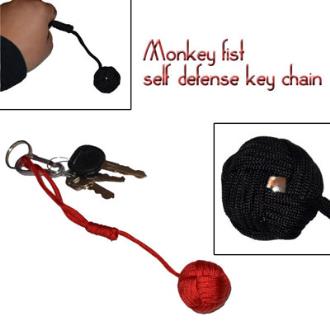 Monkey Fist Self Defense Keychain - Red. A monkey's fist is a self defense tool, so named because it looks like a small bunched fist.It is tied at the end of a rope and has a metal ball inside making it easy to throw. String is designed to be extended or shortened for your own desired length. Convenient to carry as a keychain Specifications: Ball weight: 1.5oz. String Length: 8.25" .