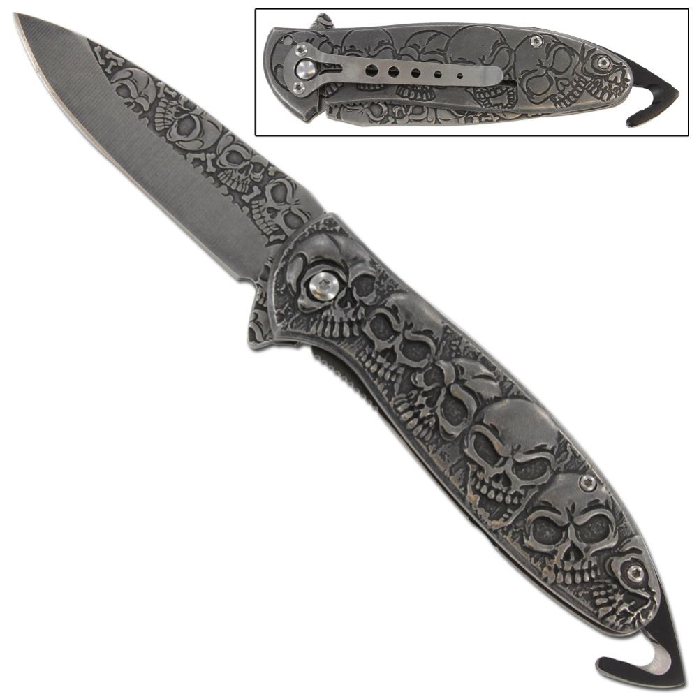 This spring assist knife has a drop point style blade that has a skull and bone design and is constructed of a 440 stainless steel with a black finish. The steel handle has a skull design with eye hole cutouts and a frame locking mechanism. The pommel is an emergency glass breaker and belt cutter. Included is a belt clip. Overall length is 8.25 inches.