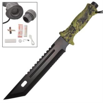 Displaying a dark green camouflaged handle the Survival Knife of Wendigos Fury comes in handy when youre out in the wilderness. The tanto blade is killer and great for defending and protecting yourself with its survival kit. Inside the smooth rubberized ABS handle lies a little kit with a fishing line, hook and weight, matches to start a fire and sandpaper and is sealed off with a steel butt cap that could work as a skull cracker if need be. A segment towards the end of the blade is serrated to saw through small limbs, ropes, belts, fishing nets and more. This gargantuan knife is always at the ready when you utilize the black nylon sheath with belt loop. Overall length is 15 Inches.
