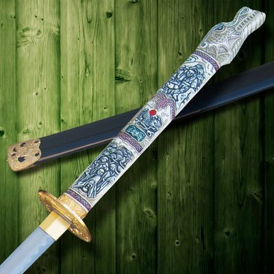 The Highlanders would definitely be proud of this amazing Sword of the Dragon Katana. It features an intricately detailed faux ivory handle which resembles a hand carved, antique Japanese katana. A 26" carbon steel blade will certainly be intimidating to your guests! 26" carbon steel blade Faux ivory handle with intricate details Brass plated tsuba and scabbard accents Includes coordinating scabbard 40 1/2" overall length