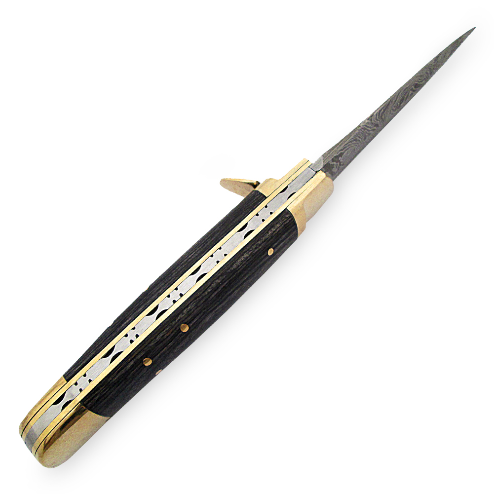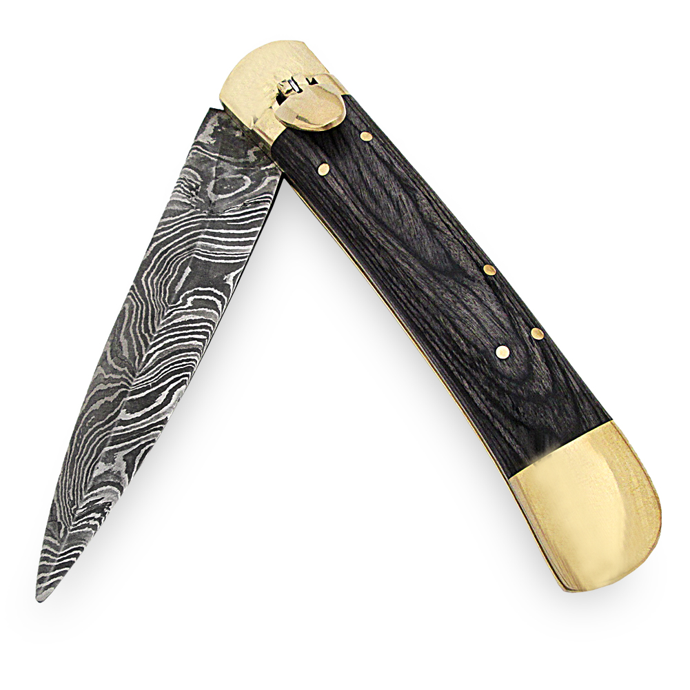We have a stunning Weathered Ash Lever Lock Damascus Auto Knife available for you. This handmade knife features a handle made of wood with a beautiful ash gray finish. The wood grain creates lovely swirls that contrast against the lighter gray background. The wooden plates are securely mounted onto a brass frame using brass pins. The lever and pommel are made of solid polished brass and have an automatic function.